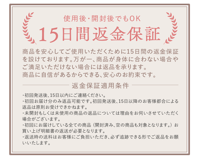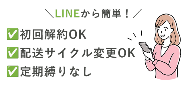※初回商品の到着後より解約が可能です。解約をご希望のお客様は、お買い上げ明細書に記載されている次回発送予定の10日前までにお電話(0120-026-232/営業時間 9:00~18:00※土日祝日を除く)にてご連絡ください。